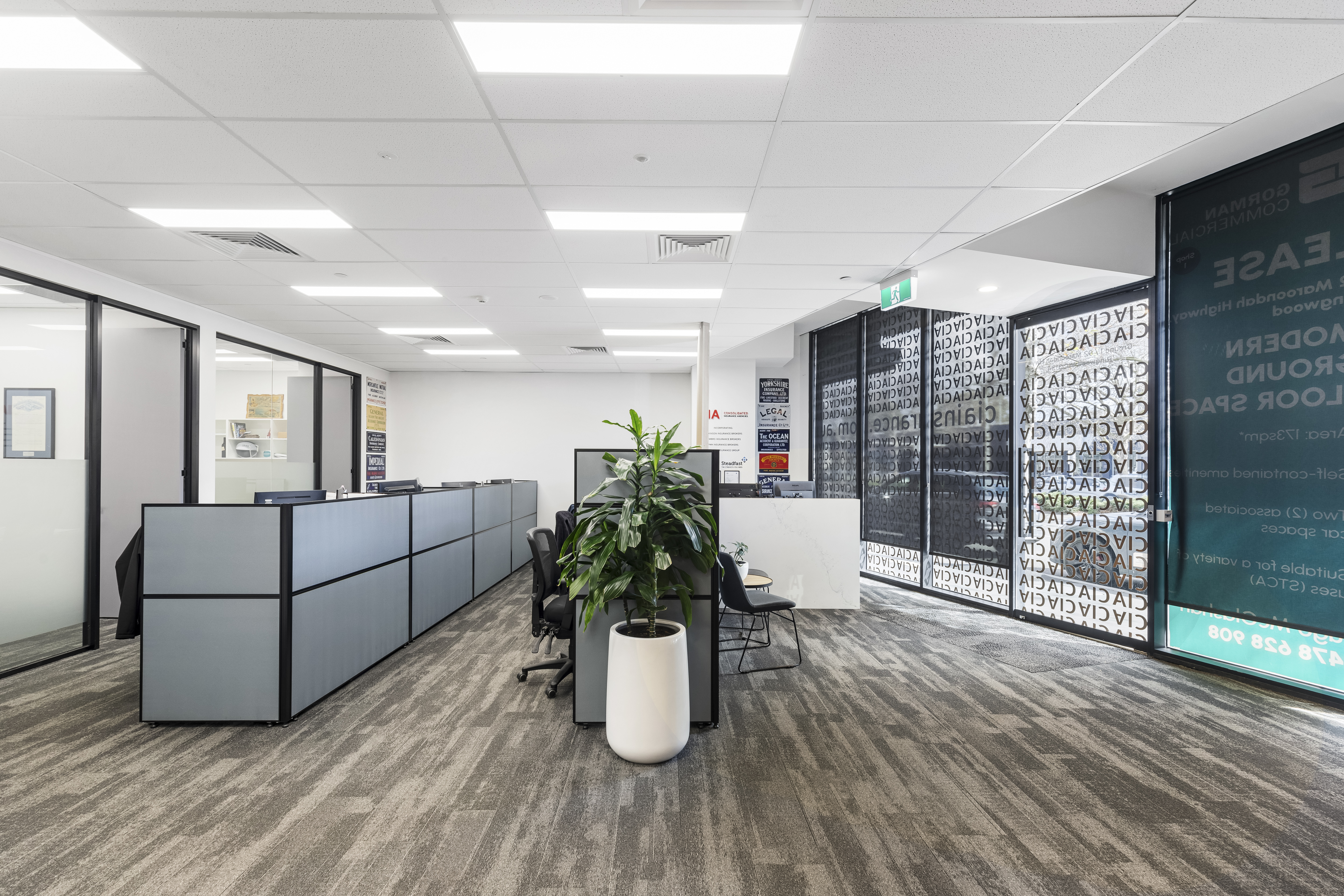 This modern office space offers a stylish and functional layout, perfect for a variety of business operations. The front area features a welcoming open-plan design, ideal for reception or collaborative work. It includes partitioned offices for privacy, a dedicated boardroom for meetings, and a modern kitchen that caters to both staff and clients.